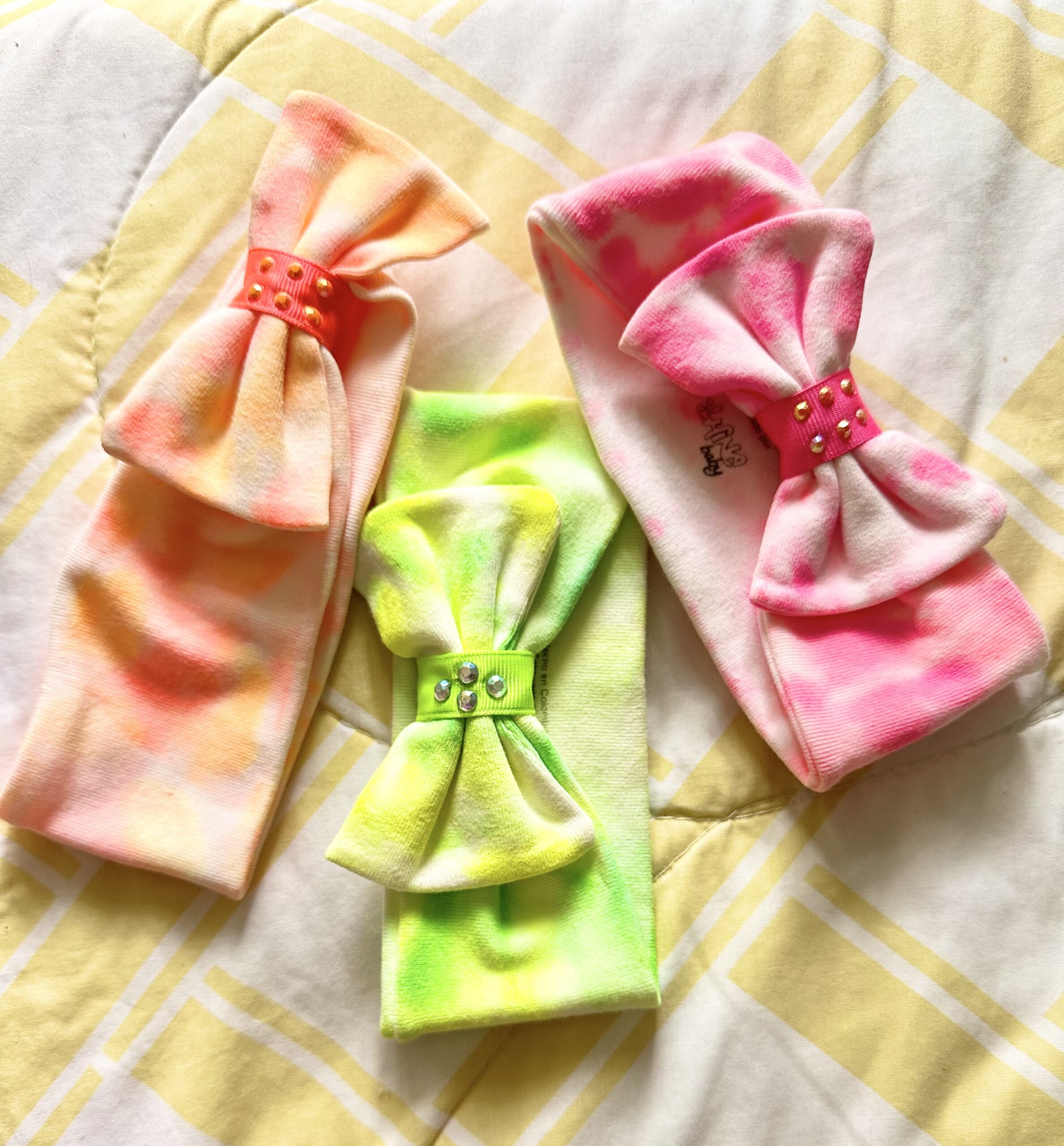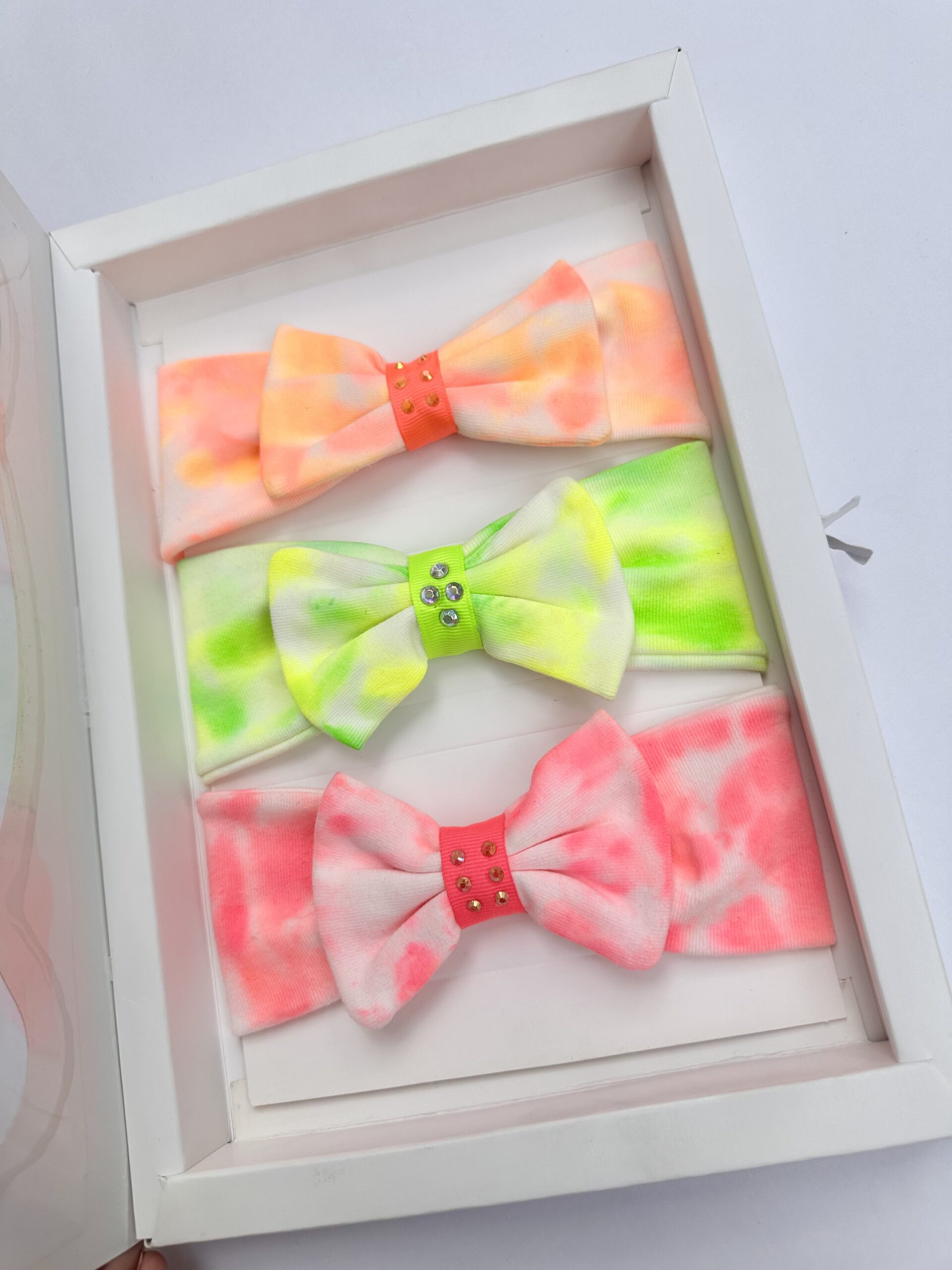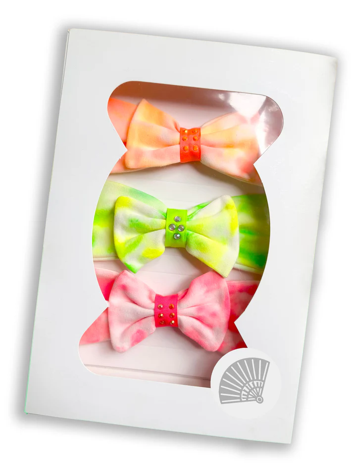 Descubre nuestro exclusivo set de tres balacas en vibrantes tonos neón —verde, naranja y fucsia— trabajadas a mano con la delicada técnica tie dye y pinturas completamente libres de tóxicos.