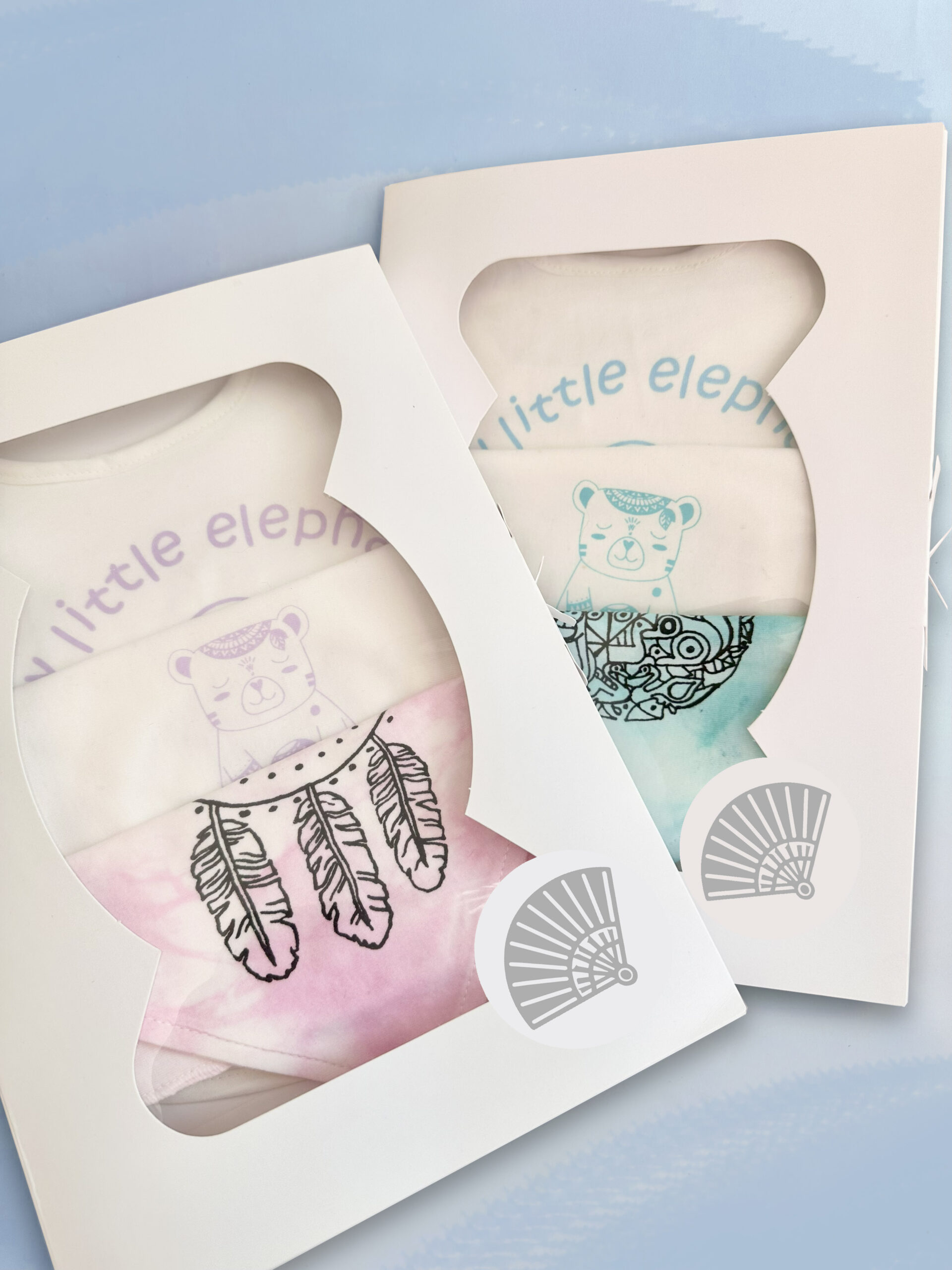 Elaborados artesanalmente en algodón 100% con técnica tie dye y pintura libre de tóxicos. Presentados en una delicada caja lista para obsequiar, disponible en motivos para niña y niño.