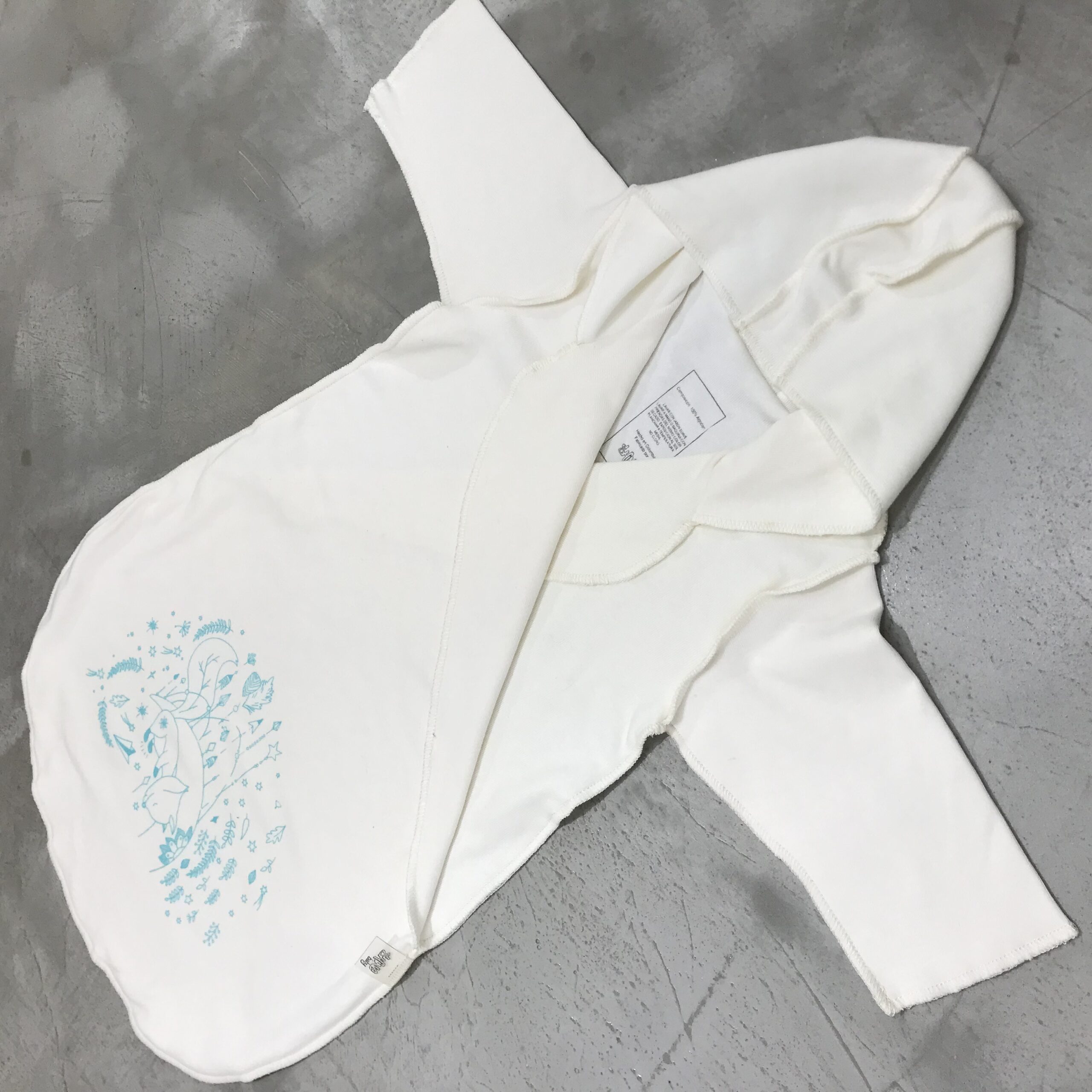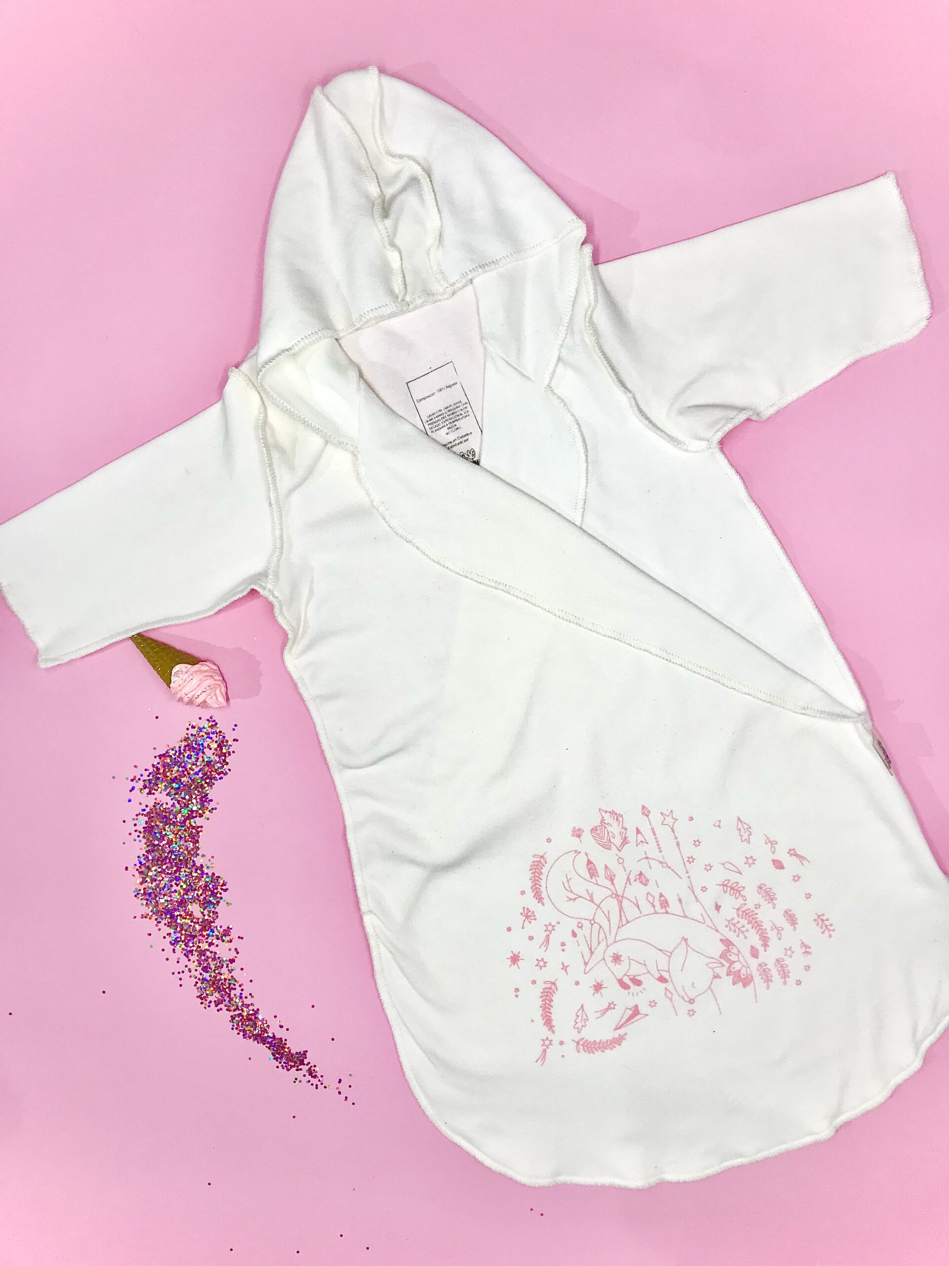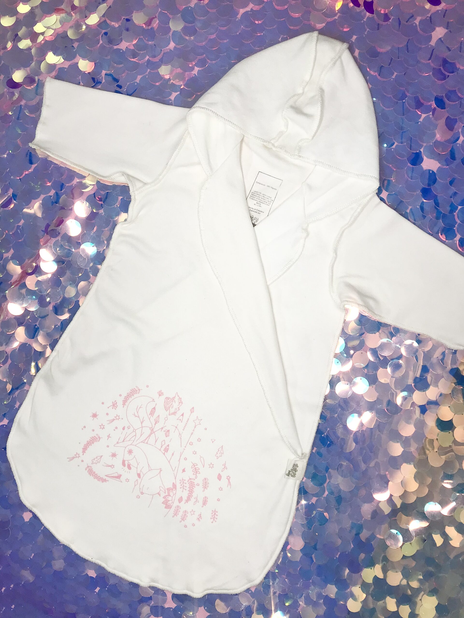 Color marfil con estampados en rosa pastel, turquesa y gris plata. Abriga sin recalentarse, perfecto para la noche, la siesta, para después del baño, para poner mientras está en el coche y como ropa de cambio en la pañalera.