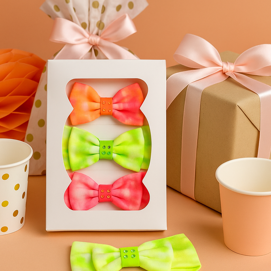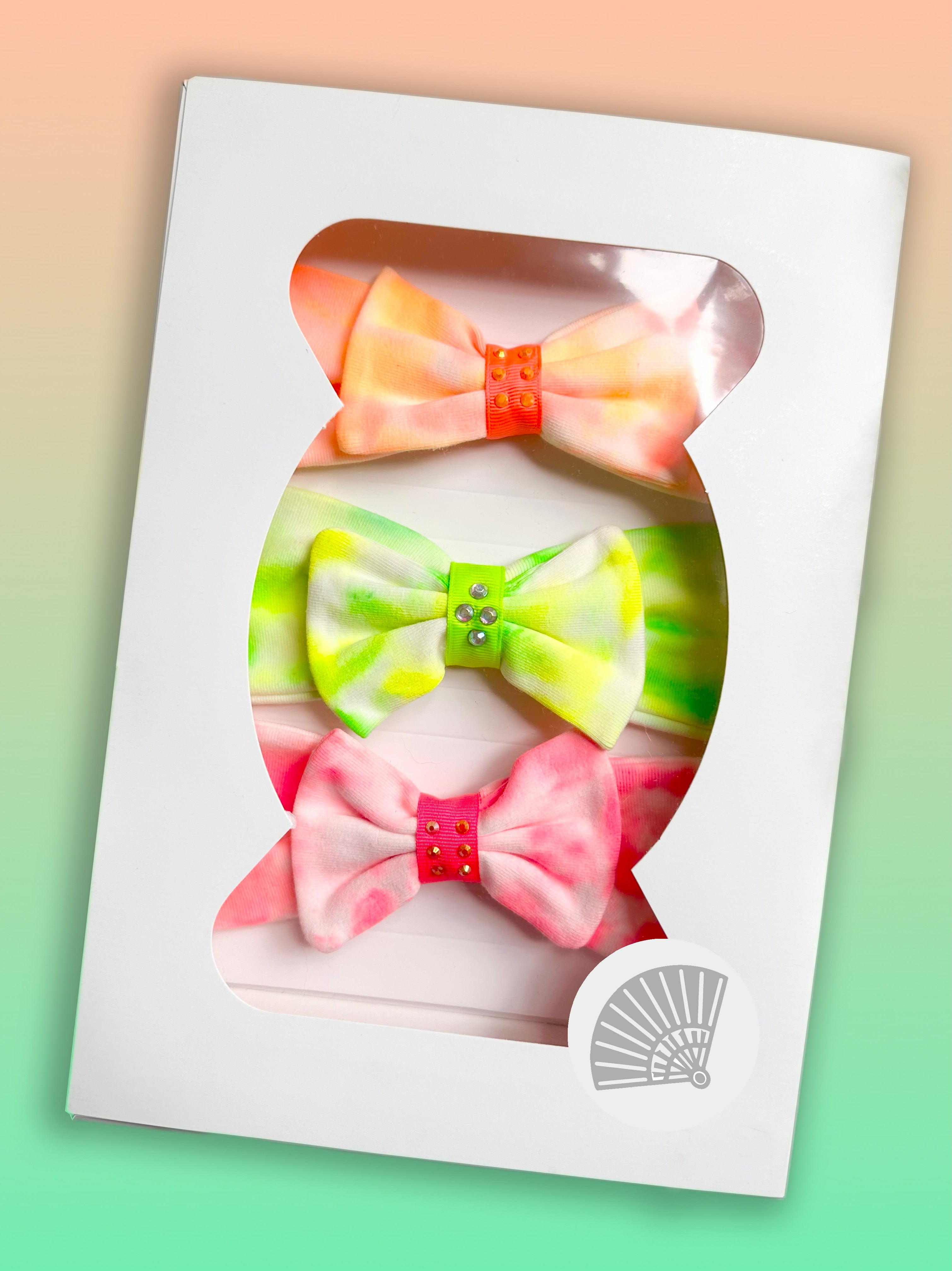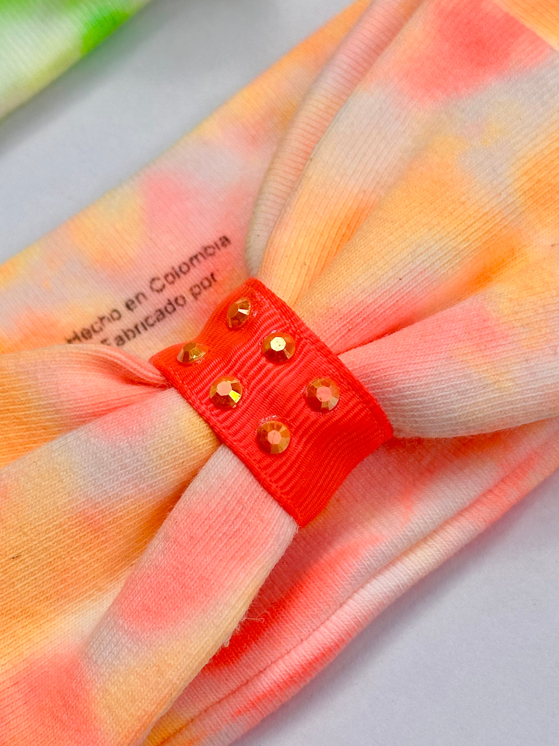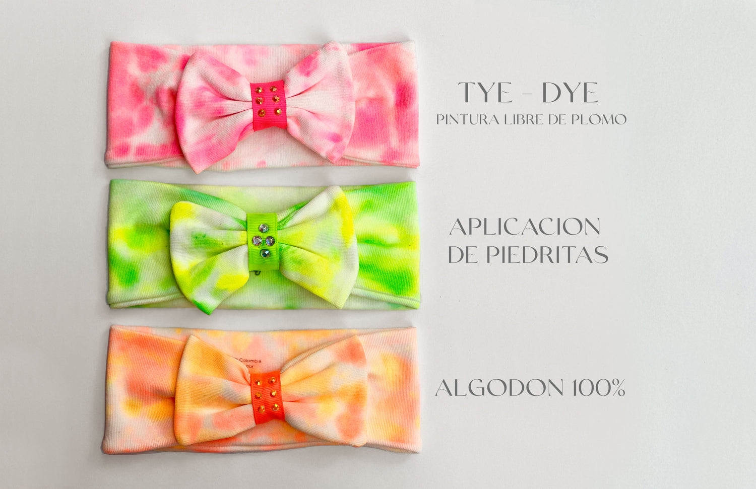 3 balacas tie-dye en tonos neón: fucsia, lima y naranja. | 100% algodón suave y transpirable. | Cinta central suave con aplicación brillante. | Elásticas, hipoalergénicas y sin marcas. | Hechas y pintadas a mano con técnica tie-dye. | Presentación en caja rígida troquelada con ventana de acetato y diseño delicado lista para regalar.