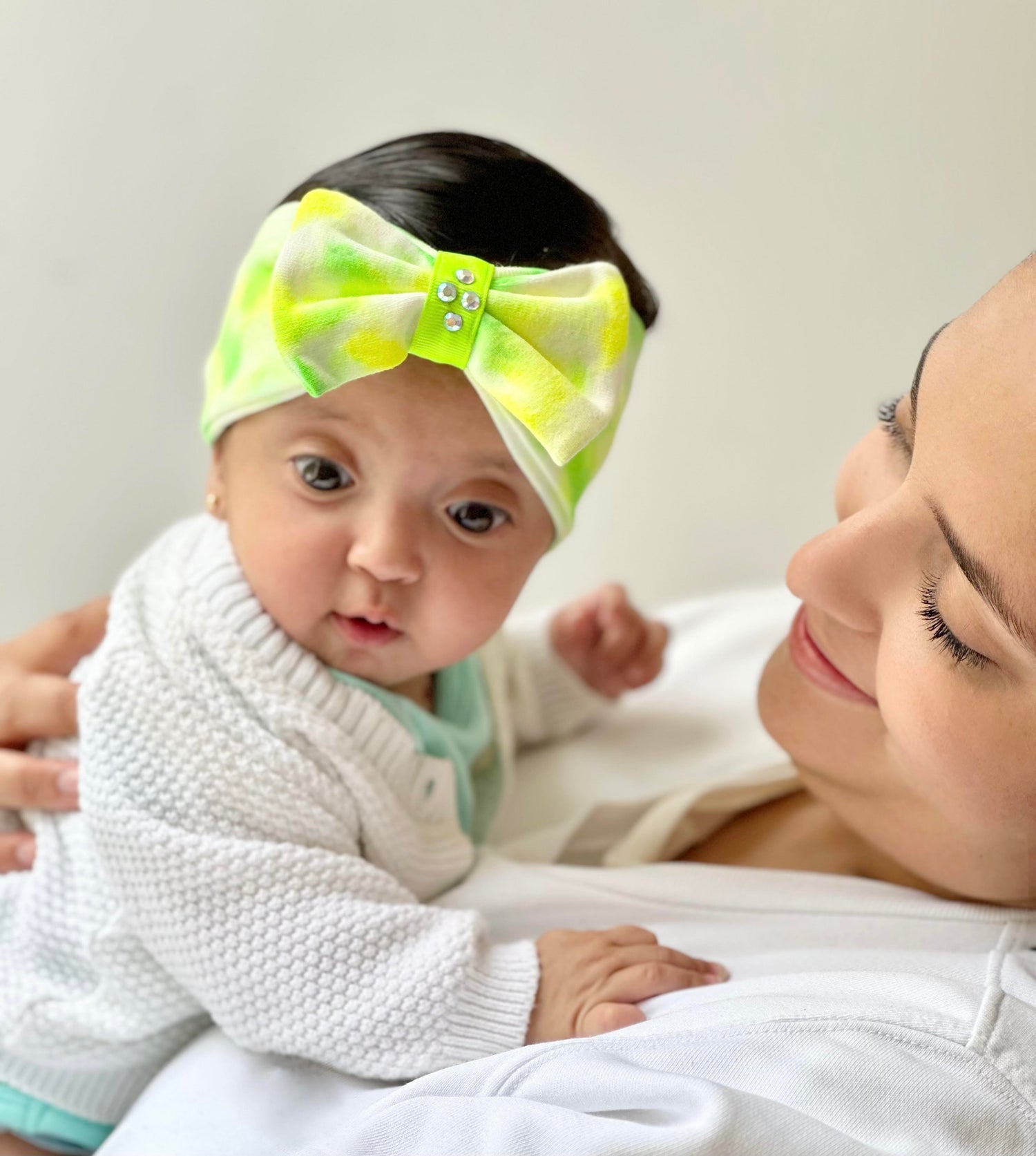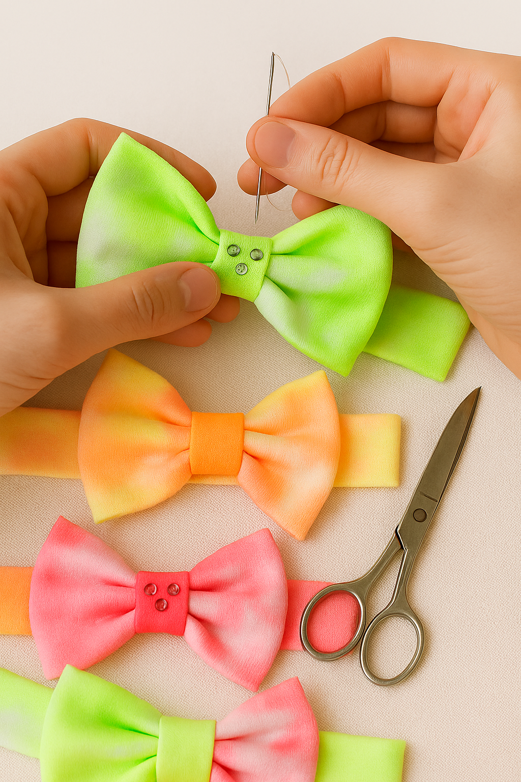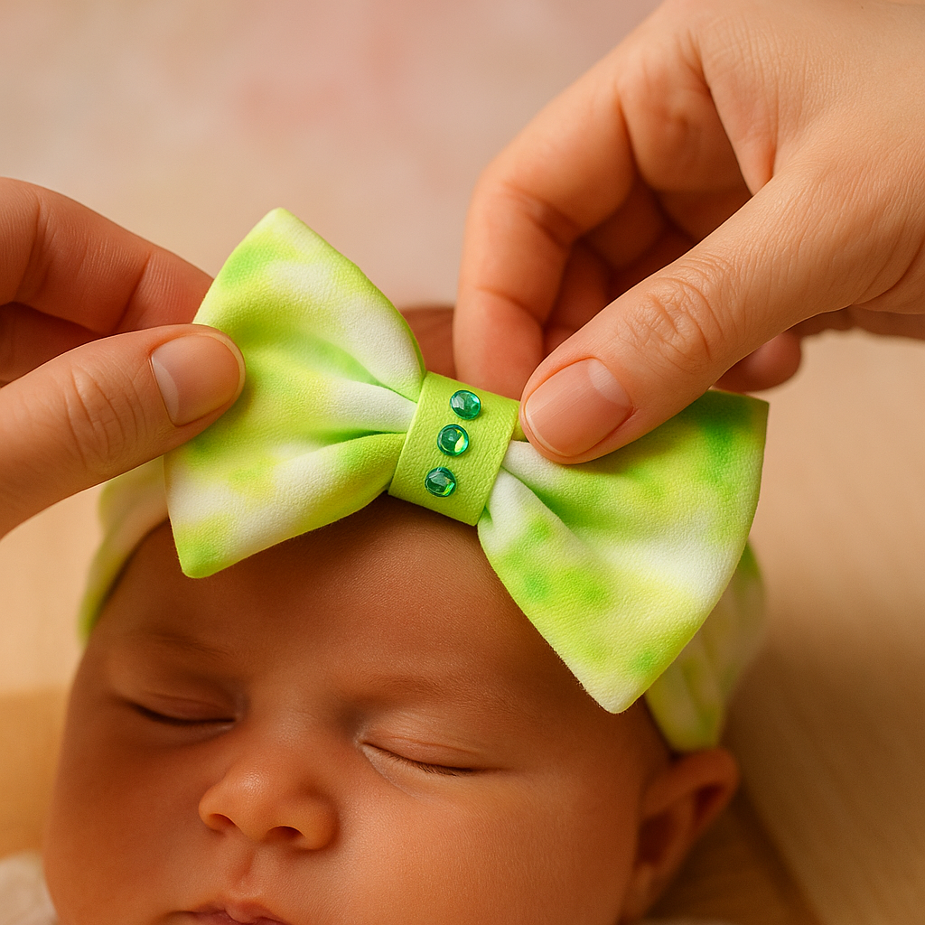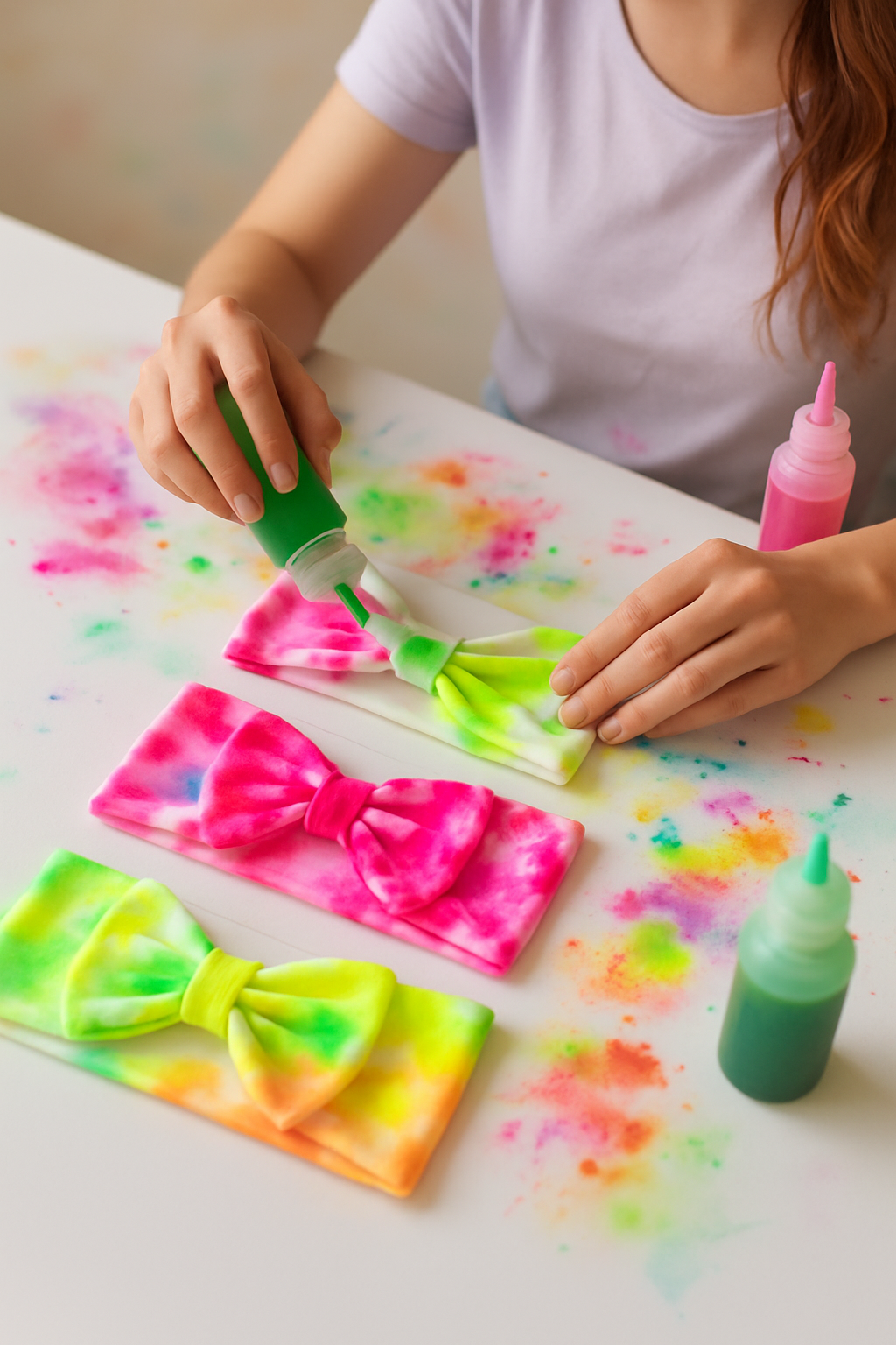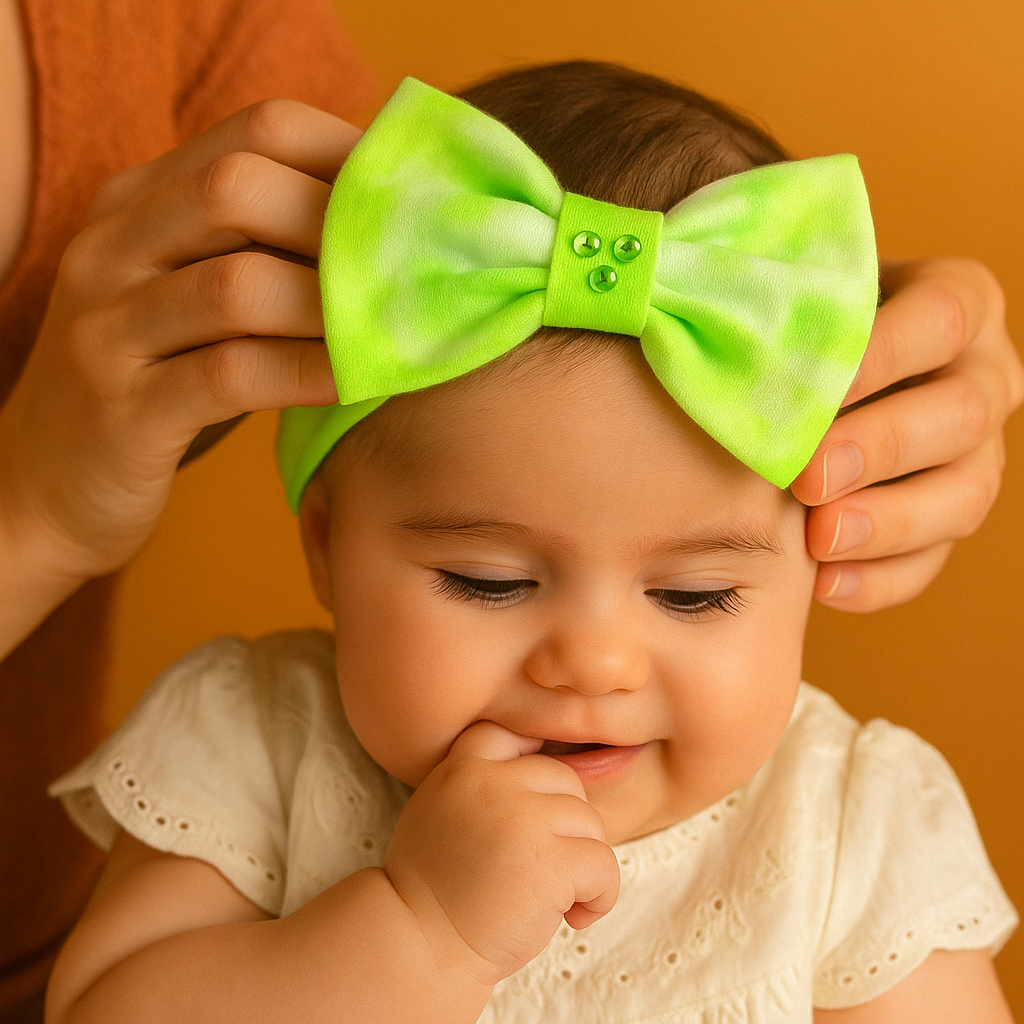 3 balacas tie-dye en tonos neón: fucsia, lima y naranja. | 100% algodón suave y transpirable. | Cinta central suave con aplicación brillante. | Elásticas, hipoalergénicas y sin marcas. | Hechas y pintadas a mano con técnica tie-dye. | Presentación en caja rígida troquelada con ventana de acetato y diseño delicado lista para regalar.