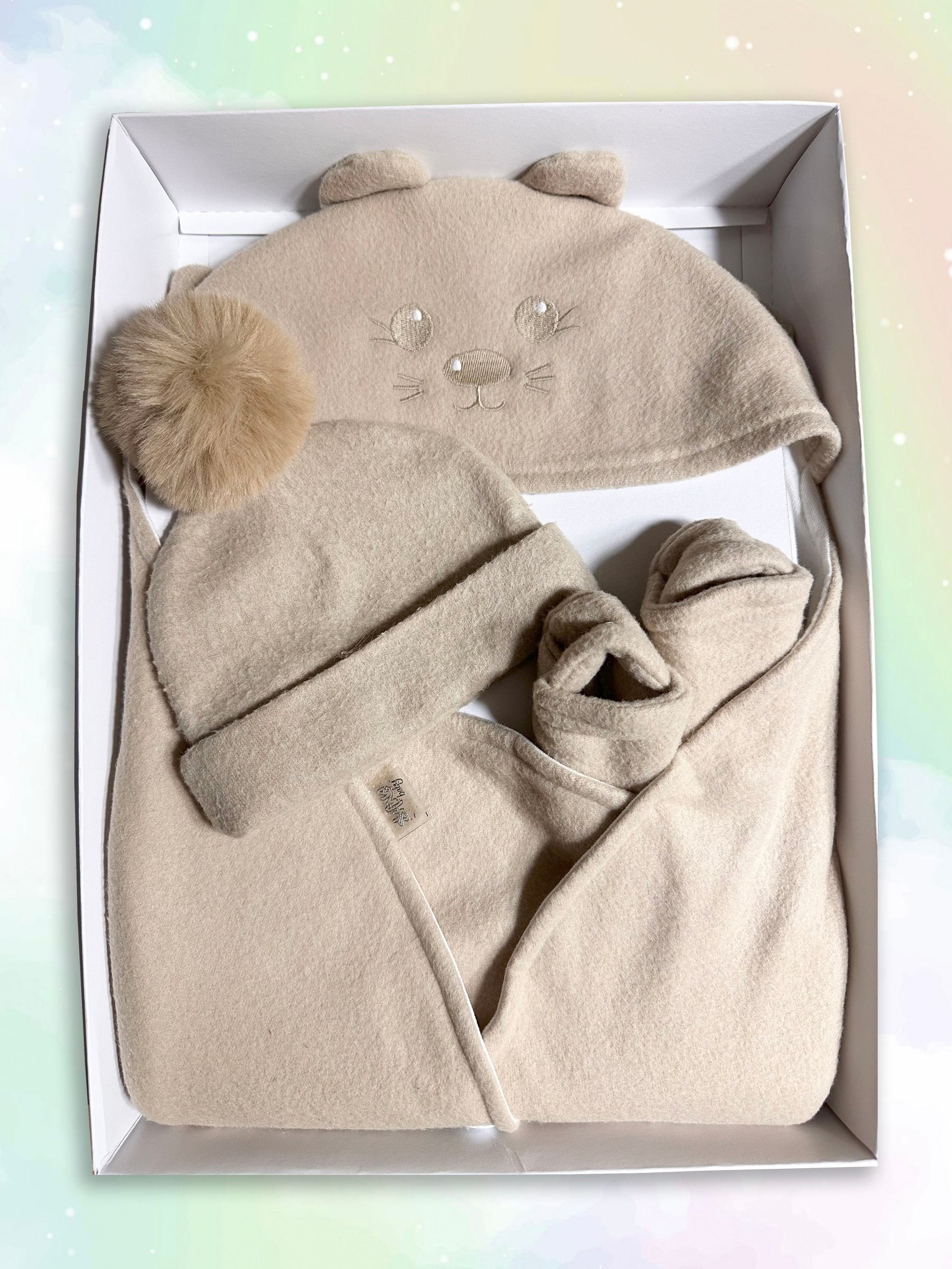 Incluye: una manta tipo arrullo, un gorrito y unos escarpines hechos con fibras delicadas, pensadas para proteger la piel sensible del bebé. | Talla única de 0 - 6 meses.