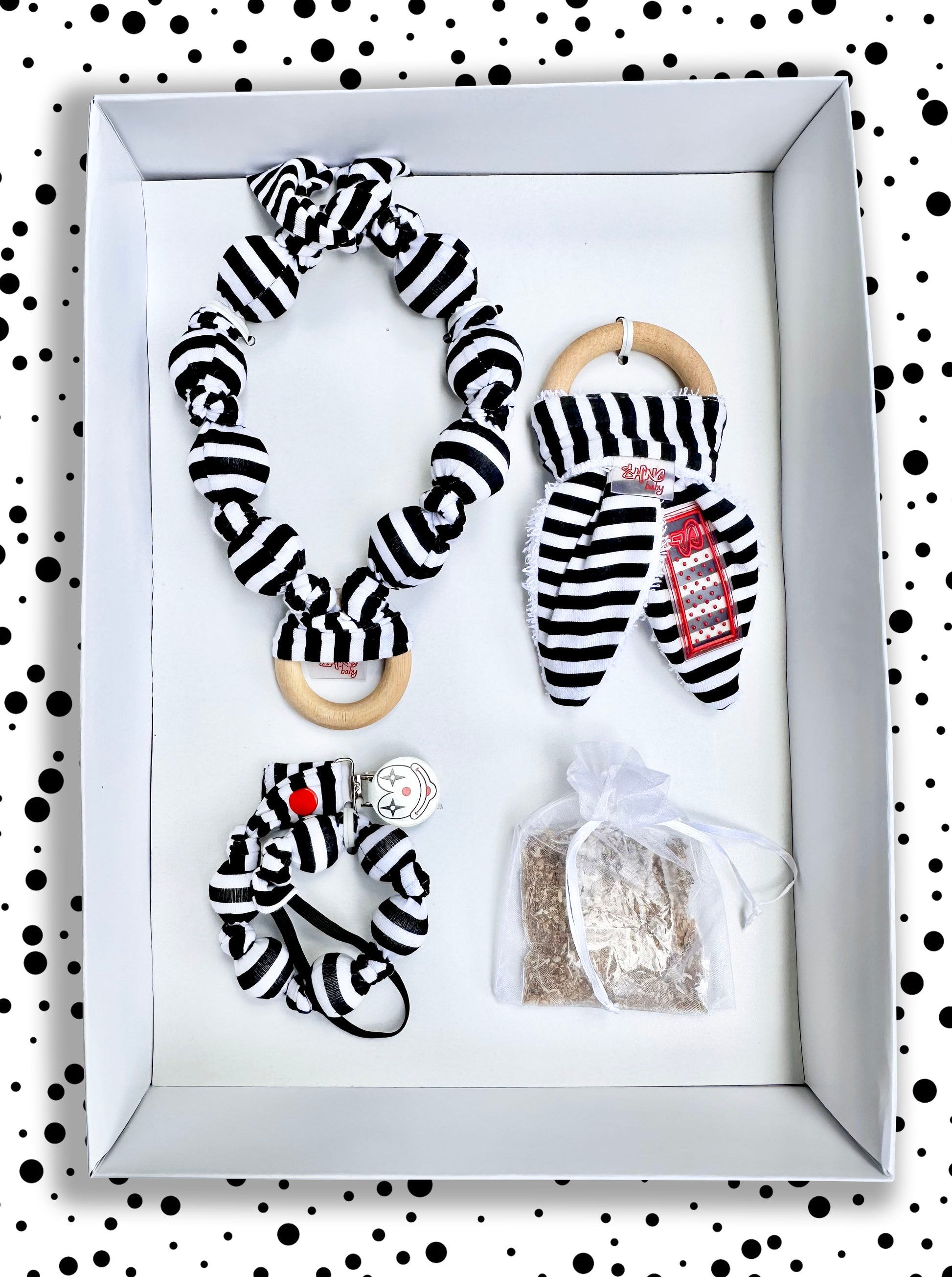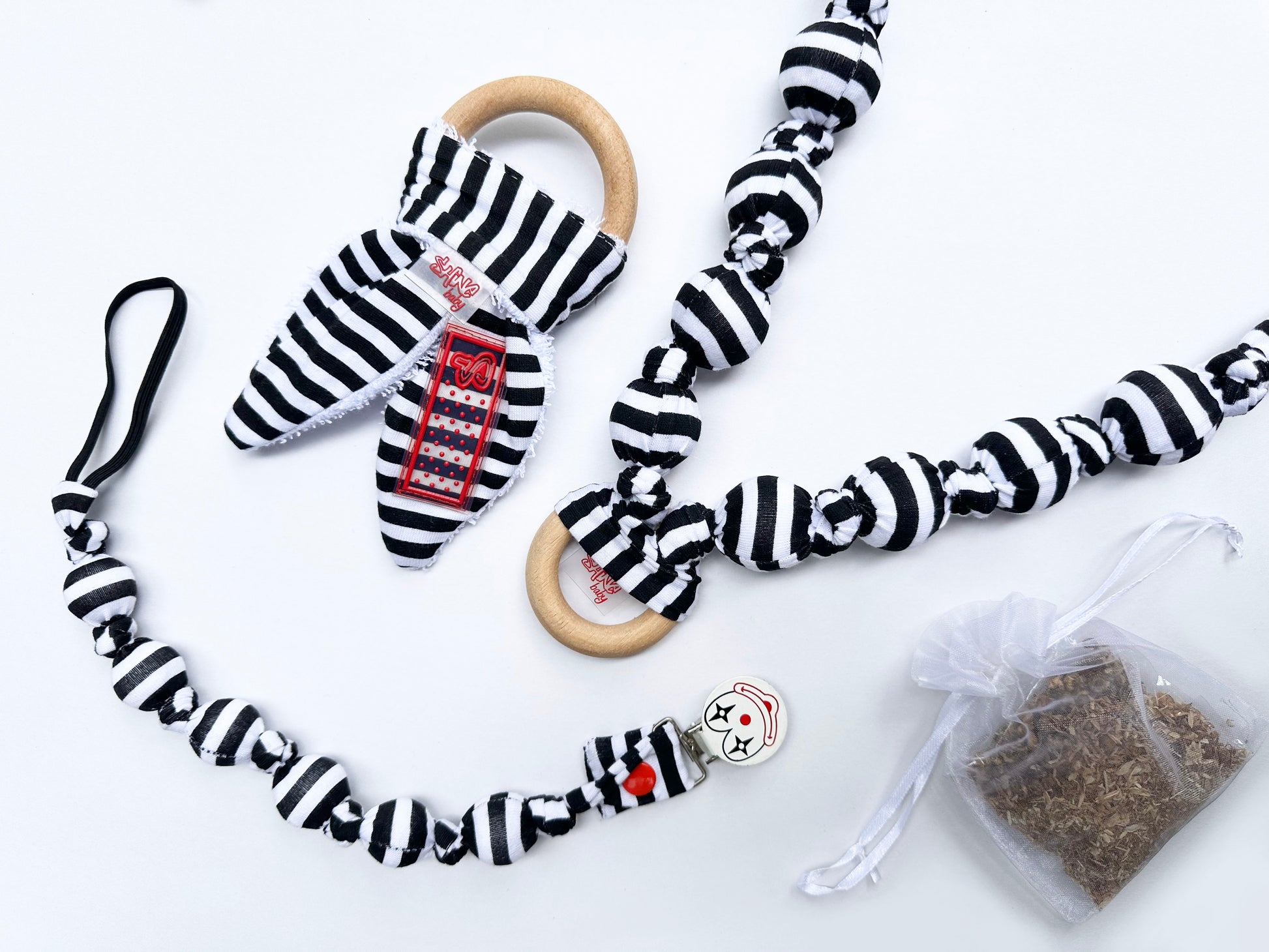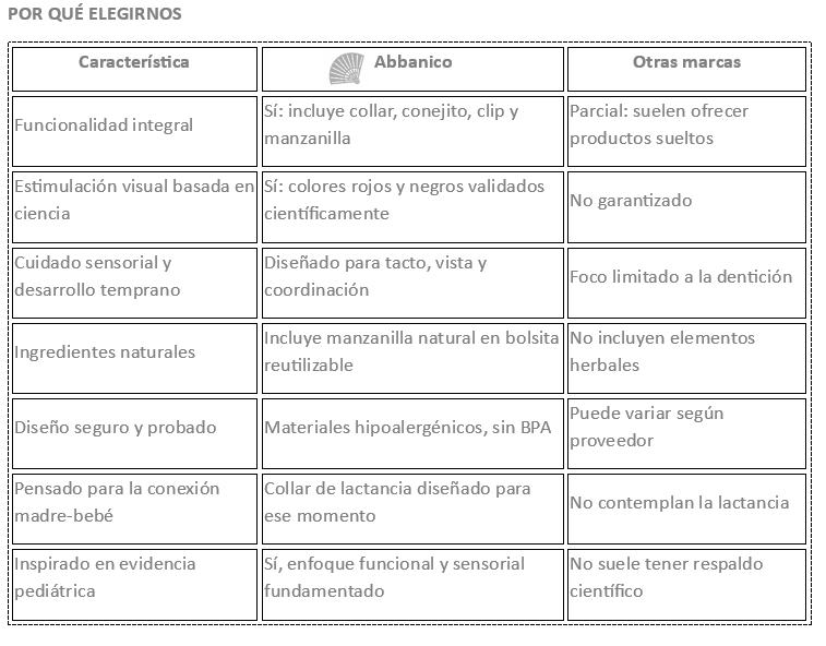 Alivio natural de la dentición gracias al poder refrescante y calmante del conejito con manzanilla. | Estimulación visual con colores de alto contraste (rojo y negro), ideales para el desarrollo visual del bebé. | Estimulación táctil y sensorial a través de diferentes texturas y formas adaptadas a manos pequeñas.| Seguridad y funcionalidad: todos los accesorios están diseñados pensando en la comodidad del bebé y la tranquilidad de mamá. | Conexión emocional durante la lactancia con el uso del collar, fomentando la atención y calma del bebé.