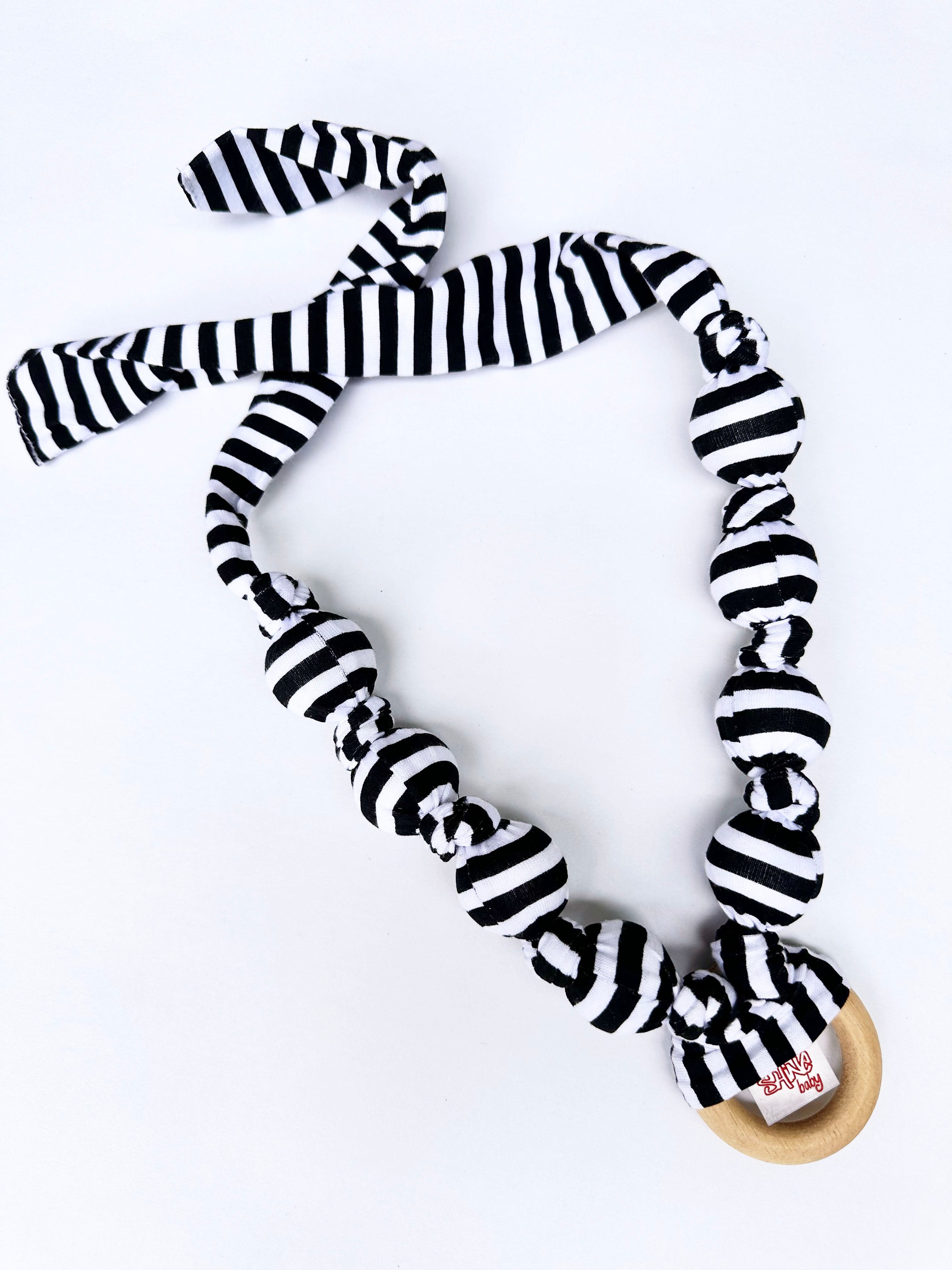 Elaborado en tela suave y madera, se puede sumergir en infusión de manzanilla y congelar para calmar las molestias de encías. Además, su diseño estimula la coordinación motora y visual.